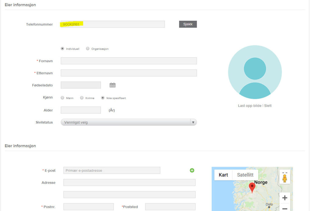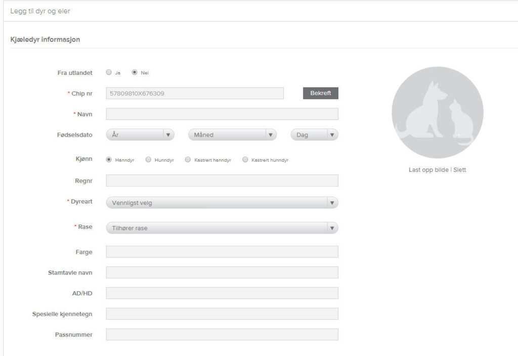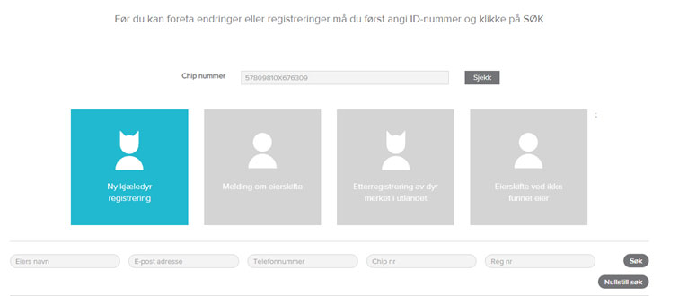Legg inn ID-nummer som skal registreres, og klikk på «Ny kjæledyr registrering» og legg inn informasjon om dyr og eier. Felt merket med * må fylles ut, de andre feltene fylles ut av eier hvis ønskelig.