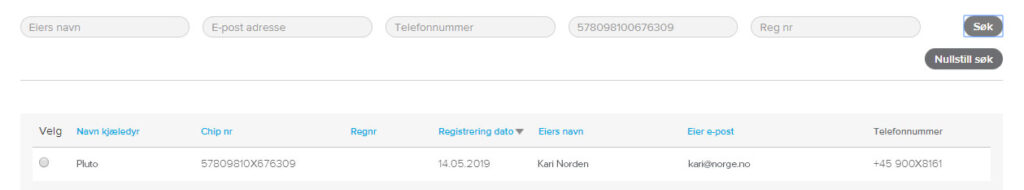Du har også muligheten til å søke i basen på dyreeiers navn, e-post, telefon nr, ID-nummer og reg nr i NKK.