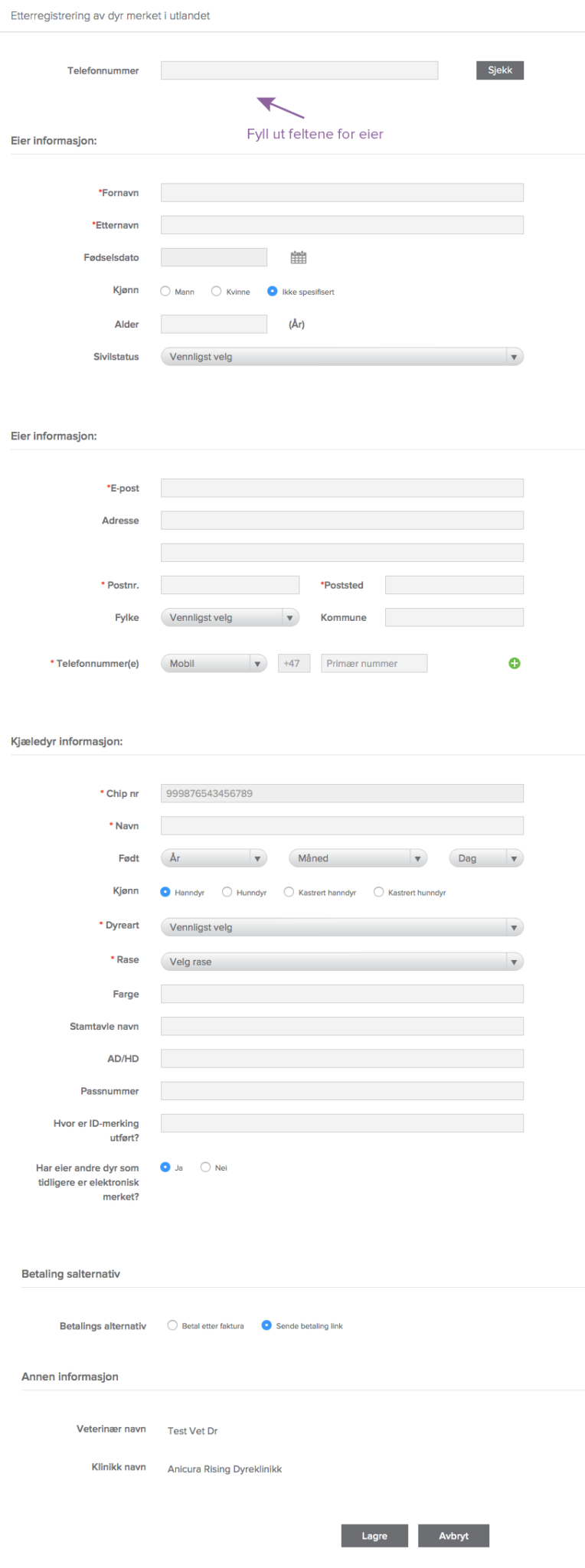 Registrering av dyr merket med utenlandsk chip( alle chipper som ikke starter med 5780) gjøres enkelt i journalsystemet som en vanlig ID-registrering. Hvis Klikk lagre og send inn.